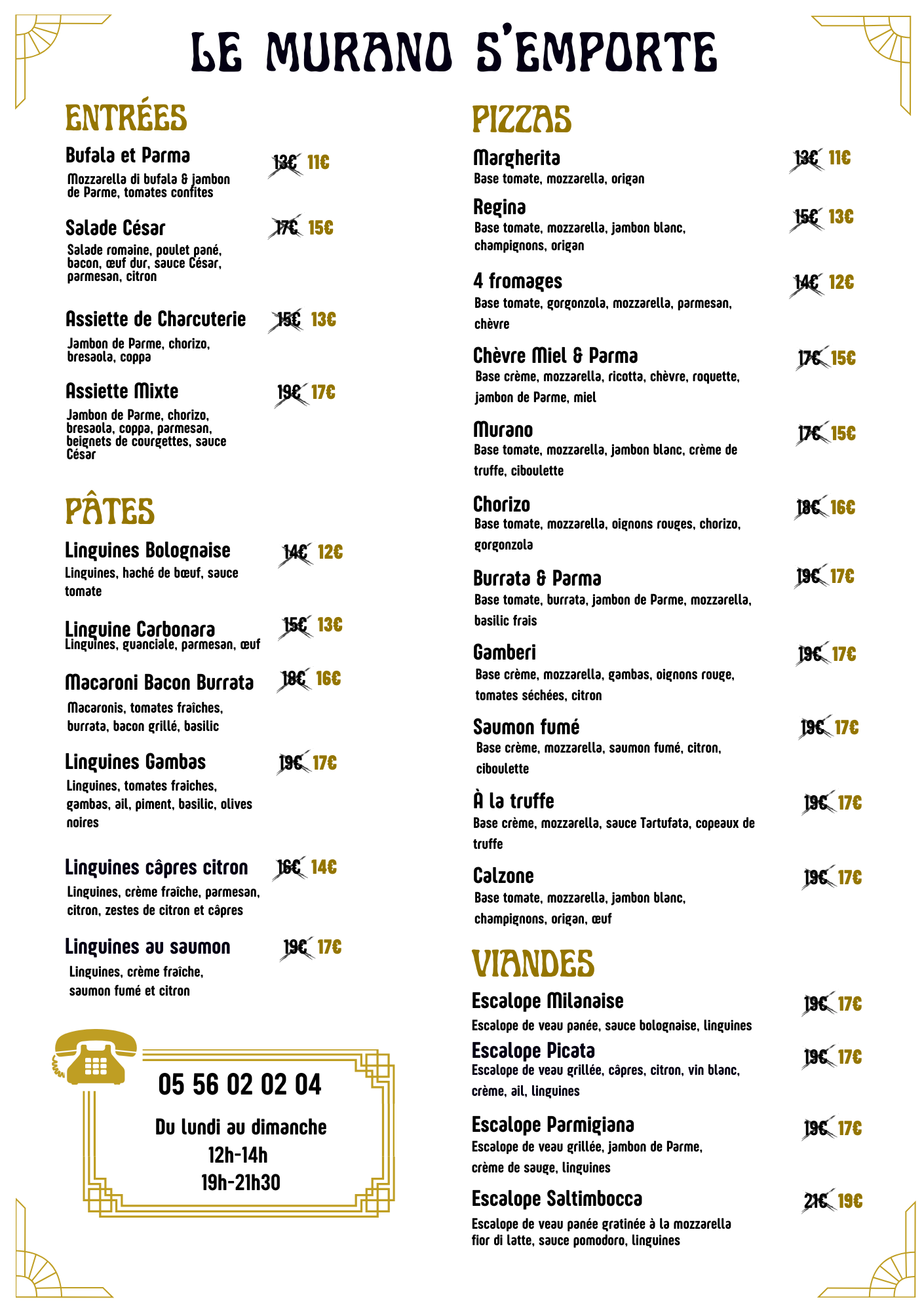 Découvrez le plaisir d'une cuisine italienne maison depuis chez vous en retirant vos plats préférés directement au Murano, tous les jours de la semaine.